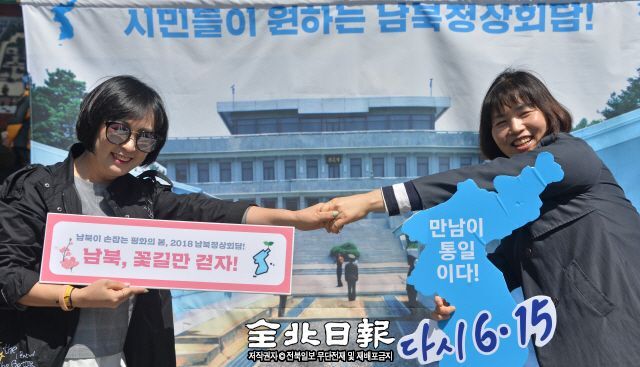 남북정상회담을 이틀 앞두고 전주 경기전 앞에서 전북겨례하나 회원들이 정상회담을 응원하는 캠페인을 실시한 25일 판문점 사진 앞에서 손을 맞잡고 기념촬영을 하고 있다.
