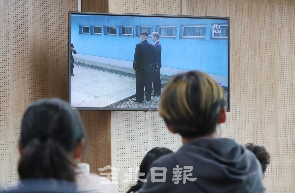 남북정상회담이 이루어진 27일 전주시 온빛초등학교 학생들이 역사적인 순간을 지켜보고 있다.