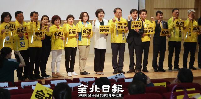 정의당 전북도당 당원대회가 열린 29일 전주중부비전센터에서 이정미 대표와 국회의원, 권태홍 도지사 후보 및 후보와 당원들이 6·13지방선거 승리를 다짐하며 화이팅을 외치고 있다.