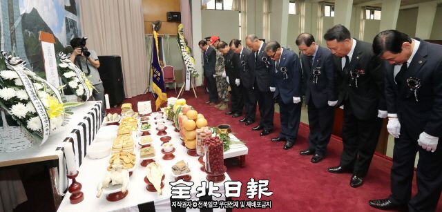 호국보훈의 달을 맞아 호국영령 합동 추모제가 열린 지난달 29일 전북 보훈회관에서 보훈단체 관계자들이 호국영령의 숭고한 넋을 기리며 묵념하고 있다.