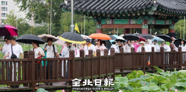 ‘제3회 전국 문화관광해설사 한마음 걷기대회’가 열린 2일 참가자들이 덕진공원을 지나고 있다.