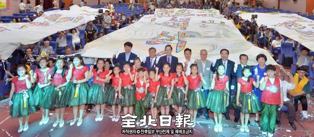 익산시와 전북도 일원에서 열리는 제99회 전국체육대회를 99일 앞둔 5일 도청 공연장에서 송하진 도지사와 도내 시장·군수들을 비롯한 관계자들이 대회의 성공적 개최를 기원하며 파이팅을 외치고 있다.