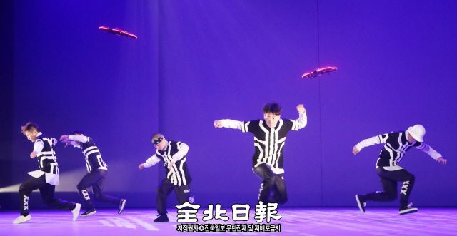 7일 드론기반 융합 미디어아트쇼 ‘꽃심, 나르샤’가 전주시 국립무형유산원 얼쑤마루 대공연장에서 열린 가운데 드론과 비보이들이 함께 어울려 멋진 춤을 추고 있다.