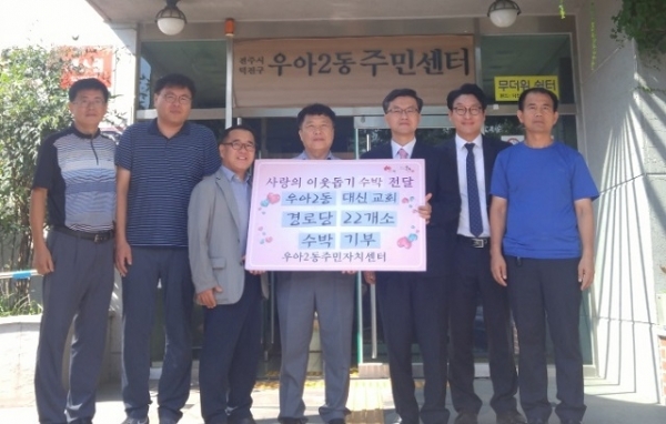 전주시 덕진구 산정동 소재 대신교회(목사 송영걸)는 지난 17일 우아2동주민센터(동장 백기욱)를 방문해 연이은 폭염으로 더위에 취약한 어르신들이 시원한 여름을 보낼 수 있도록 관내 경로당 22개소에 수박을 전달했다.