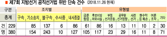 범죄 유형을 보면 후보비방과 허위사실공표가 86건 117명으로 가장 많았다. 금품향응 제공이 61건 105명으로 뒤를 이었고 부정선거운동 16건 23명, 공무원 개입 13건 29명, 사전선거 11건 16명, 현수막·벽보훼손 10건 11명 순이었다.