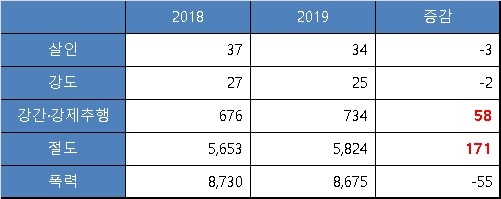 이는 전년도 대비 살인 3건·강도 2건·폭력 55건 감소한 반면, 강간 및 강제추행 58건·절도 171건 늘었다.
