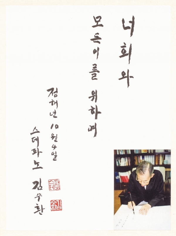 이 문구는 김수환 추기경의 세상 모든 이를 향한 ‘사랑의 신학’을 표현한 것으로, 김 추기경의 일생을 관통하는 주제였다. 지난 1966년 마산교구장 주교 서품식에서 자신의 사목 표어로 ‘여러분과 또한 많은 이들을 위하여’를 선택했고 훗날 서울대교구장 착좌 때에 해석을 조금 고쳐서 사용한 것이다.