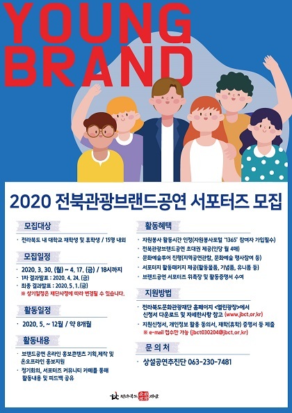 30일부터 오는 4월 17일까지 모집하는 ‘2020 전북관광브랜드공연 서포터즈’에는 ‘영 브랜드’라는 이름이 붙었다. 이는 젊음(young)과 전북관광브랜드(brand)공연의 합성어로, ‘20대 젊은 청춘들과 함께 만들어 가는 브랜드공연’이라는 뜻을 담고 있다.
