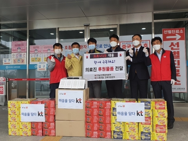 KT전남/전북광역본부와 KT노동조합 전북지방본부는 1일 남원, 군산의료원 의료진들에게 KT직원들이 모은 사랑나눔기금으로 마련한 휴대폰 보조배터리 300개와 라면을 기부하는 사회공헌 활동을 펼쳤다.