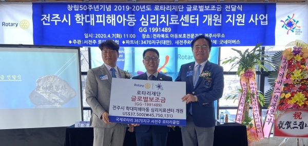 이번 보조금은 서전주로타리클럽이 학대피해아동의 효과적인 심리치료 지원을 위해 마련했다. 글로벌보조금은 전라북도아동보호전문기관 전주사무소에서 아동학대 후유증을 겪고 있는 전주시내 학대피해아동을 위해 심리치료실 설치 및 심리정서지원 비용으로 사용될 예정이다.