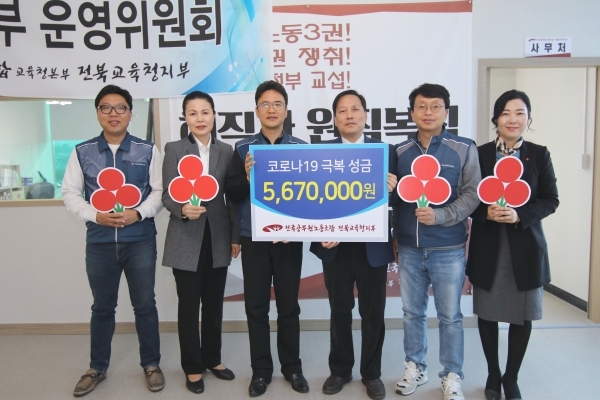 이번 성금은 코로나19로 인해 어려움을 겪고 있는 저소득층 전북 초·중·고등학교의 저소득층 학생들을 위해 조합원 2200여명이 십시일반 참여해 마련됐다.