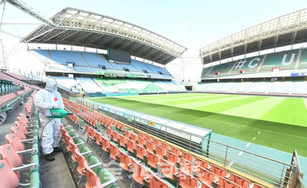 코로나19의 여파로 개막이 2개월 늦어진 K리그 프로축구 개막을 하루 앞둔 7일 전주월드컵경기장에서 직원들이 축구장 곳곳을 소독하고 있다. 개막전은 8일 저녁 7시 전북현대와 수원삼성간 무관중 경기로 치러지며 유튜브와 트위터로 생중계된다.
