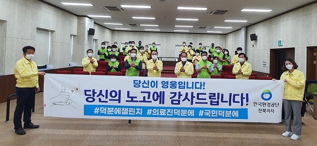환경부 산하 한국환경공단 호남권지역본부 전북지사(지사장 서창혁)는 27일 코로나19 위기 극복을 위해 방역 및 의료현장 등에서 헌신하는 의료진을 응원하고자 ‘#덕분에챌린지’에 동참했다.