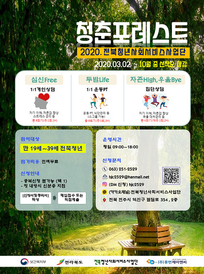 청춘포레스트는 전북청년사회서비스사업단의 대면서비스로 전북청년(만19~39세 이하)의 행복감 증진을 위해 신체와 정신 건강을 지원하는 사업이다. 청년들의 자존감 증진과 우울 감소, 스트레스 관리, 자아 탐색, 취업 역량을 높일 수 있도록 개인 상담, 집단상담, 개인PT, 집단특강 등의 프로그램을 운영하고 있다.