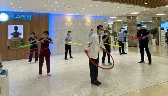 이날 병원 로비에서 진행된 훌라후프 챌린지에는 예수병원 임직원 10명이 참여했다.