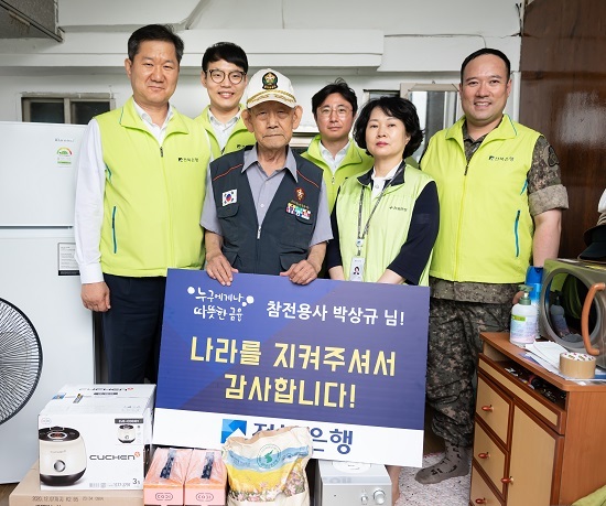 전북은행 안전관리실 직원 일동은 전북동부보훈지청의 추천을 받아 전주지역 일대 거주하는 6.25 참전용사를 방문, 가스레인지, 냉장고, 싱크대, 전기밥솥, 선풍기 등의 생활가전과 쌀, 라면, 화장지 등의 생필품을 직접 구매해 참전용사의 가정에 전달했다.