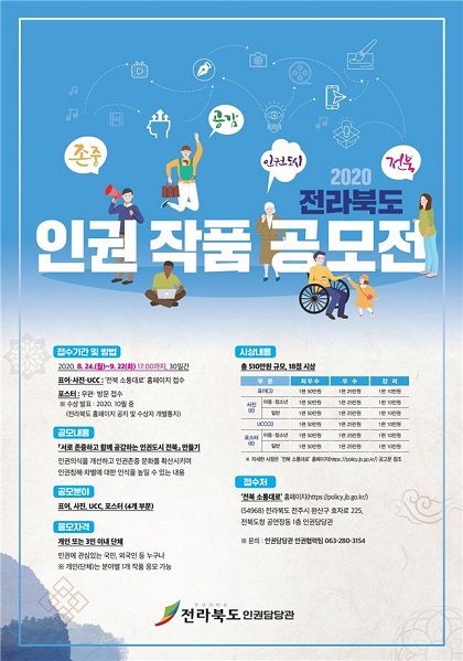 전북도는 인권존중 문화를 확산하고 인권 의식 향상을 위해 ‘2020 전라북도 인권작품 공모전’을 개최한다고 밝혔다.