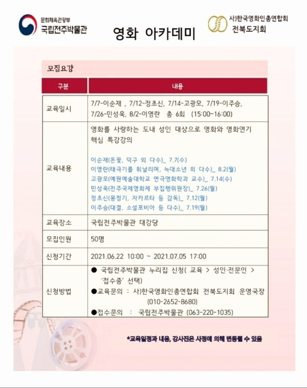 국립전주박물관(관장 홍진근)과 사단법인 한국영화인총연합회 전북도지회는 7월 7일부터 8월 2일까지 대강당에서 ‘2021년 영화아카데미’강좌를 운영한다.