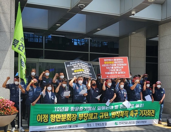 민주노총 전국건설노동조합 전북지역본부는 13일 오전 전북도청 앞에서 기자회견을 열고 “노조 활동을 이유로 부당하게 해고된 이정 군산지회 항만분회장을 원직복직하라”고 촉구했다.