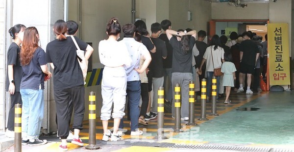 30일 전주화선선별진료소에서 시민들이 코로나19 검사를 받기 위해 길게 줄 서 있다.