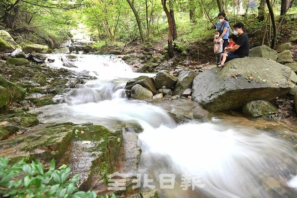 가을장마로 모악산 계곡을 따라 물이 굽이치며 절경을 이루고 있다. 2일 모악산을 찾은 한 가족이 계곡 옆에서 휴식을 취하고 있다.