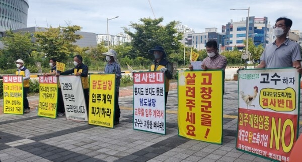 고창 고수면 주민들이 닭 도축·가공 업체 동우팜투테이블의 입주 환경평가를 진행하고 있는 전북지방환경청에 ‘부동의’ 할 것을 촉구했다.