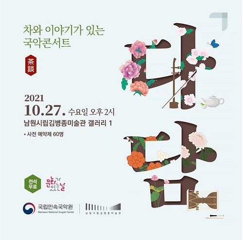 국립민속국악원(원장 왕기석)은 10월 27일 오후 2시에 전북 남원의 떠오르는 지역 명소인 남원시립김병종미술관에서 ‘차와 이야기가 있는 국악 콘서트 다담’ 공연을 개최한다고 밝혔다.