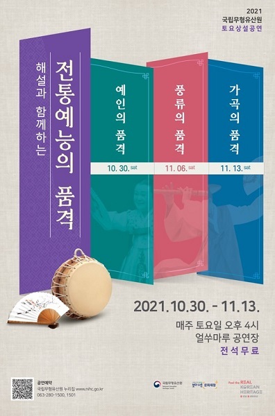 국립무형유산원(원장 이종희)이 오는 11월 13일까지 매주 토요일 오후 4시에 국립무형유산원 얼쑤 마루 공연장에서 ‘해설과 함께하는 무형유산공연, 전통예능의 품격’을 진행한다.