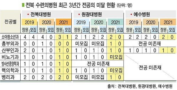 최근 3년 간 전북대 · 원광대 · 예수병원 전공의 미달사태