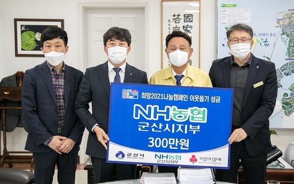 NH농협은행 군산시지부(지부장 김대호)가 12일 군산시에 이웃돕기성금 300만원을 기탁했다.