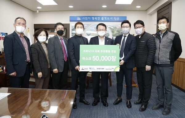 초록우산어린이재단 익산후원회(회장 유기달)·초록우산어린이재단 전북지역본부(본부장 구미희)·㈜에스제이캠(대표이사 배동수)·㈜칸스포츠(대표이사 이용복) 등은 지난 12일 정헌율 익산시장을 방문해 지역아동센터와 드림스타트 등 아이들을 위해 써 달라며 마스크 5만장(시가 800만원 상당)을 기탁했다.