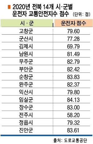 도내 타 시·군의 운전자교통안전 지수는 김제시 69.79점, 군산시 77.28점, 정읍시 79.32점, 고창군 79.60점, 익산시 79.80점, 남원시 81.49점, 완주 82.37점, 부안군 82.42점, 무주군 82.79점, 장수군 83.00점, 진안군 83.61점, 순창군 83.83점, 임실군 84.13점 등이었다.