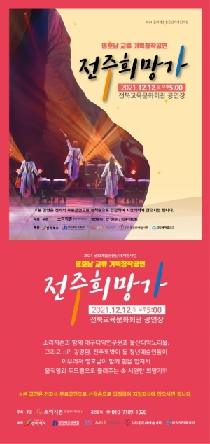 이미정 대표는 “코로나 시국이지만 서로에게 힘이 되어주던 시간들이 쌓여 예술과 지역을 잇는 가교가 돼 동서공감의 의미있는 자리를 펼치게 됐다”며 “지역과 장르를 벗어나 한마음으로 울리는 ‘전주희망가’가 찾아오는 모든 분들에게 위로와 힘이 되는 시간이길 바란다”고 말했다.