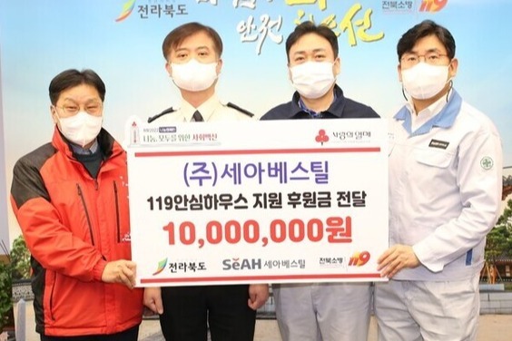 이날 후원금 전달식에는 최민철 전북소방본부장, 세아베스틸 서현승 노조위원장, 전북공동모금회 박용훈 사무처장이 참석했다. 후원금은 119안심하우스 사업을 통해 도내 화재피해주민의 자립을 돕는데 활용 될 예정이다.