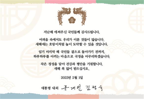 문 대통령은 설 선물에 동봉한 인사말 카드에서 “임기 마지막 해 국민들 곁으로 돌아가기 전까지, 하루하루를 아끼는 마음으로 국정을 마무리하겠다”고 밝혔다.