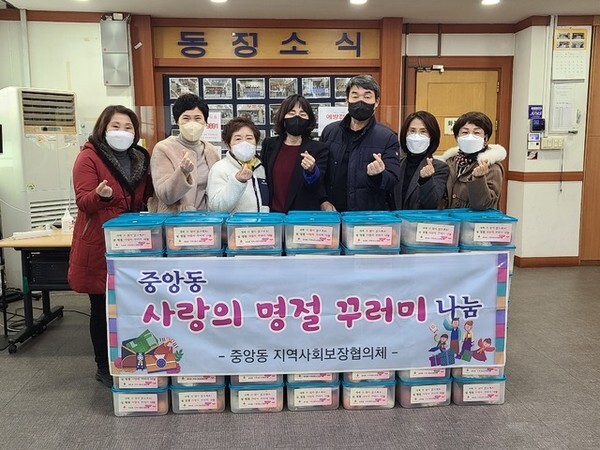 중앙동 지역사회보장협의체(위원장 김호정)는 27일 관내 취약계층에게 전달해 달라며 과일과 전, 떡으로 구성된 사랑의 설 명절음식 꾸러미 100세트를 동 주민센터에 전달했다.