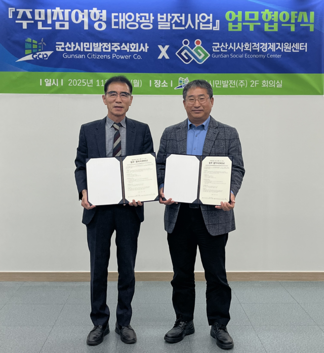 군산시 재생에너지 사업 전담기관인 군산시민발전(대표이사 최영환)과 군산시사회적경제지원센터(센터장 최기혁)가 지난 17일 ‘시민참여형 태양광 발전사업’ 업무협약을 체결했다.