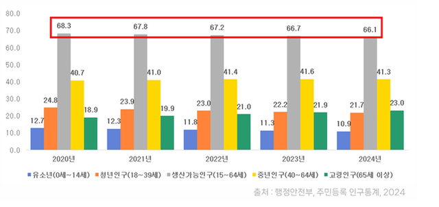 지역경제의 지표가 되는 생산가능인구(15~64세)는 2020년 68.3%, 2021년 67.8%, 2022년 67.2%, 2023년 66.7%, 2024년 66.1%를 기록했으며 5년 사이 2.2%p 감소했다.