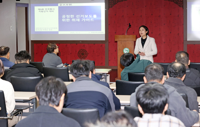 전북일보사가 제9회 전국동시지방선거를 앞두고 공정한 선거보도 체계 확립을 위한 사내 자체 연수 프로그램을 진행했다. 5일 본사 2층 화하관에서 열린 공정선거보도 연수에서 박채은 중앙선거관리위원회 인터넷선거기사 심의팀장이 강사로 나서 선거보도 심의제도와 주요 사례를 중심으로 강의했다.