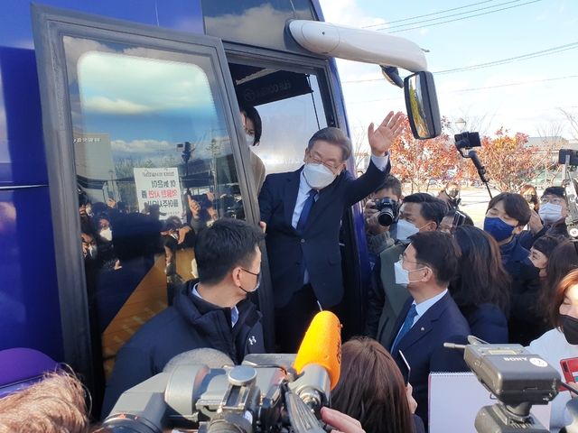 2021년 12월 3일 익산 국가식품클러스터를 찾은 당시 이재명 더불어민주당 대선 후보가 매타버스(매주 타는 민생 버스)에서 내리면서 손을 흔들고 있다./사진=송승욱 기자