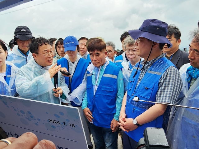 2024년 7월 18일 익산 망성면 내촌리 방축마을에서 정헌율 익산시장이 당시 이재명 더불어민주당 당대표 후보에게 익산지역 피해 현황을 보고하며 특별재난지역 선포를 위한 당 차원의 적극적인 지원을 요청하고 있다./사진=송승욱 기자