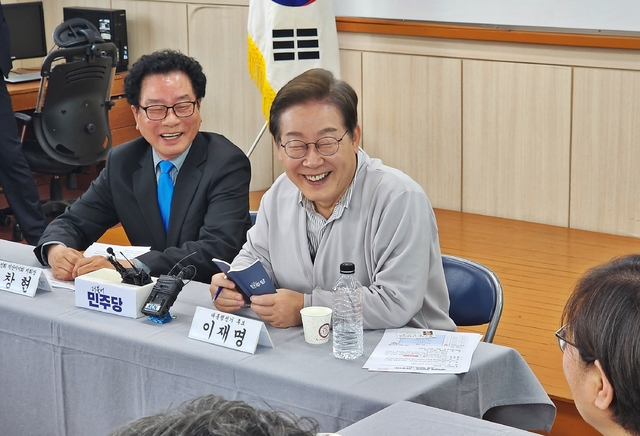 지난 5월 7일 익산을 찾은 당시 이재명 더불어민주당 대선 후보가 대한노인회 익산시지회 간담회에서 대화를 나누고 있다./사진=송승욱 기자