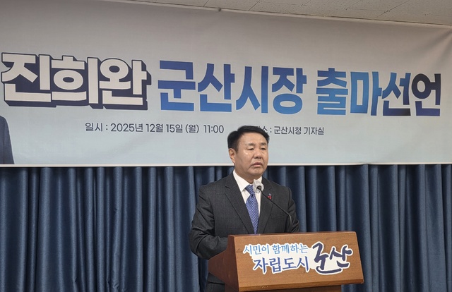 진희완 제7대 군산시의회 의장이 15일 군산시청 브리핑룸에서 기자회견을 열고 내년 지방선거 군산시장 출마를 공식 선언했다.