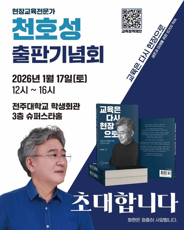 천호성 교수 전주교대 교수 역시 오는 17일 12시 전주대 슈퍼스타홀에서 출판기념회를 연다. ‘교육은 다시 현장으로’를 주제로 한 책을 소개하며, 교육철학과 정책 비전을 시민들과 직접 나누는 자리로 마련된다.