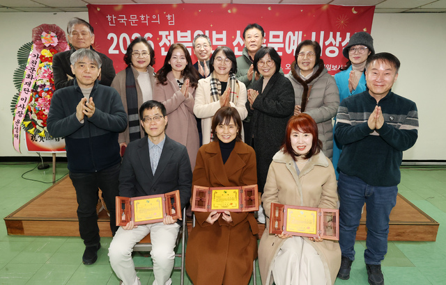 지난 14일 본사 7층서 열린 2026년 전북일보 신춘문예 시상식서 전북일보문우회 회원들과 2026 전북일보 신춘문예 당선자 3인이 기념사진을 찍고있다. 조현욱 기자.