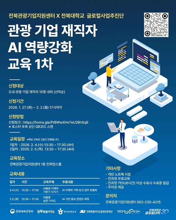 모집 인원은 도내 관광기업 재직자 15명 내외로 선착순으로 마감한다. 접수 기간은 27일부터 2월 2일 오후 5시까지다. 참여를 원하는 재직자는 전북관광기업지원센터 누리집에 게시된 신청 링크나 포스터의 QR코드를 통해 신청할 수 있다.