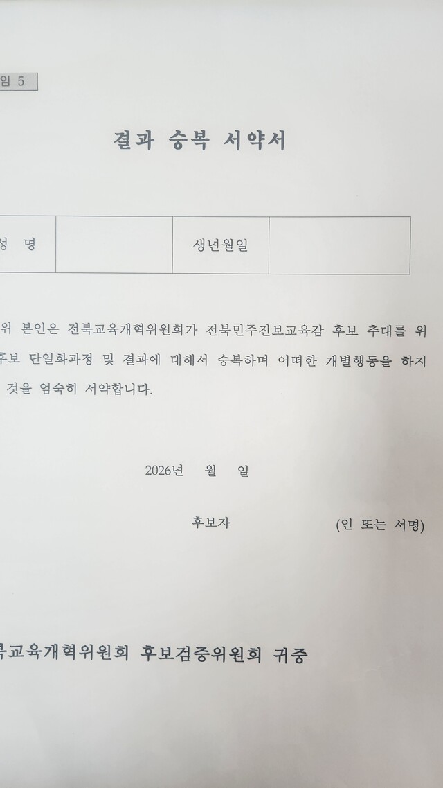 전북교육개혁위가 작성한 ‘결과 승복 서약서’에는 “위 본인은 전북교육개혁위원회가 전북민주진보교육감 후보 추대를 위한 후보 단일화과정 및 결과에 대해서 승복하며 어떠한 개별행동을 하지 않을 것을 엄숙히 서약합니다”라고 게재 돼 있다.