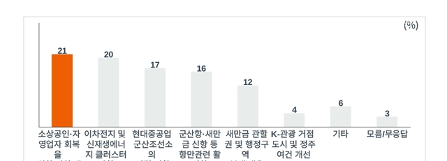 반면 60대(26%)는 ‘소상공인‧자영업자 회복을 위한 지원 대책'을, 70세 이상(24%)은 군산항‧새만금 신항 등 항만관련 활성화 등을 우선순위로 뽑았다.