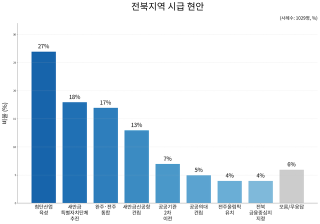 이어 ‘새만금 특별자치단체 추진’이 18%였으며, ‘완주·전주 통합’ 17%, ‘새만금 신공항 건립’ 13% 등의 순으로 답했다.