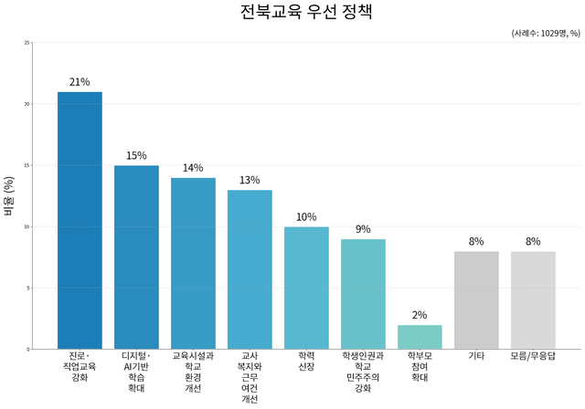 전북일보와 JTV, 전라일보 의뢰로 케이스텟리서치가 지난 13일부터 15일까지 실시한 ‘전북지역 지방선거 관련 여론조사’에서 ‘차기 전북교육감이 가장 우선으로 추진해야 할 정책은 무엇이라고 생각하냐’는 질문에 응답자의 21%가 ‘진로·직업교육 강화’를 선택했다. 다음으로는 디지털 AI기반 학습 확대 15%, 교육시설과 학교환경 개선 14%, 교사 복지와 근무 여건 개선 13%, 학력신장 10%, 학생 인권과 학교 민주주의 강화 9%, 학부모 참여 확대 2%, 기타 8%, 모름/무응답 8% 순이었다.